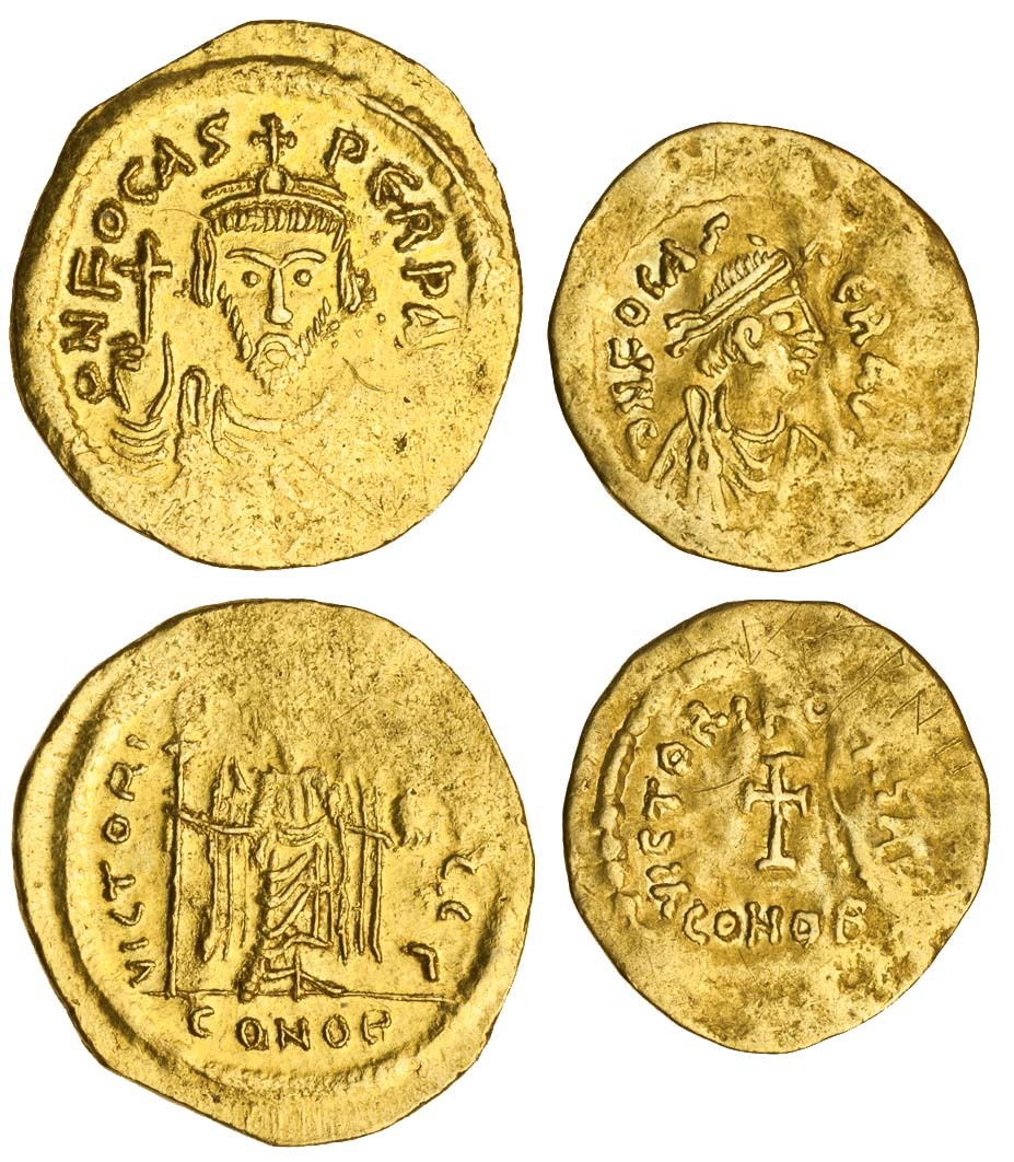 Focas (AD 602-610), AV Solidus, 4.49g, Constantinople, crowned, draped and cuirassed facing, holding cross on globe, rev. victori a avgg, angel standing facing, holding staff surmounted by Christogarm and cross on globe, conob in exergue (Sear 618; DOC 5), area of weak striking on obverse, corresponding with a similar area on reverse, extremely fine, together with a AV Tremissis, 1.42g, diademed, draped and cuirassed bust right, rev. victori focas avg, cross potent, conob in exergue (Sear 633; DOC 18), slightly wavy, very fine              (2)