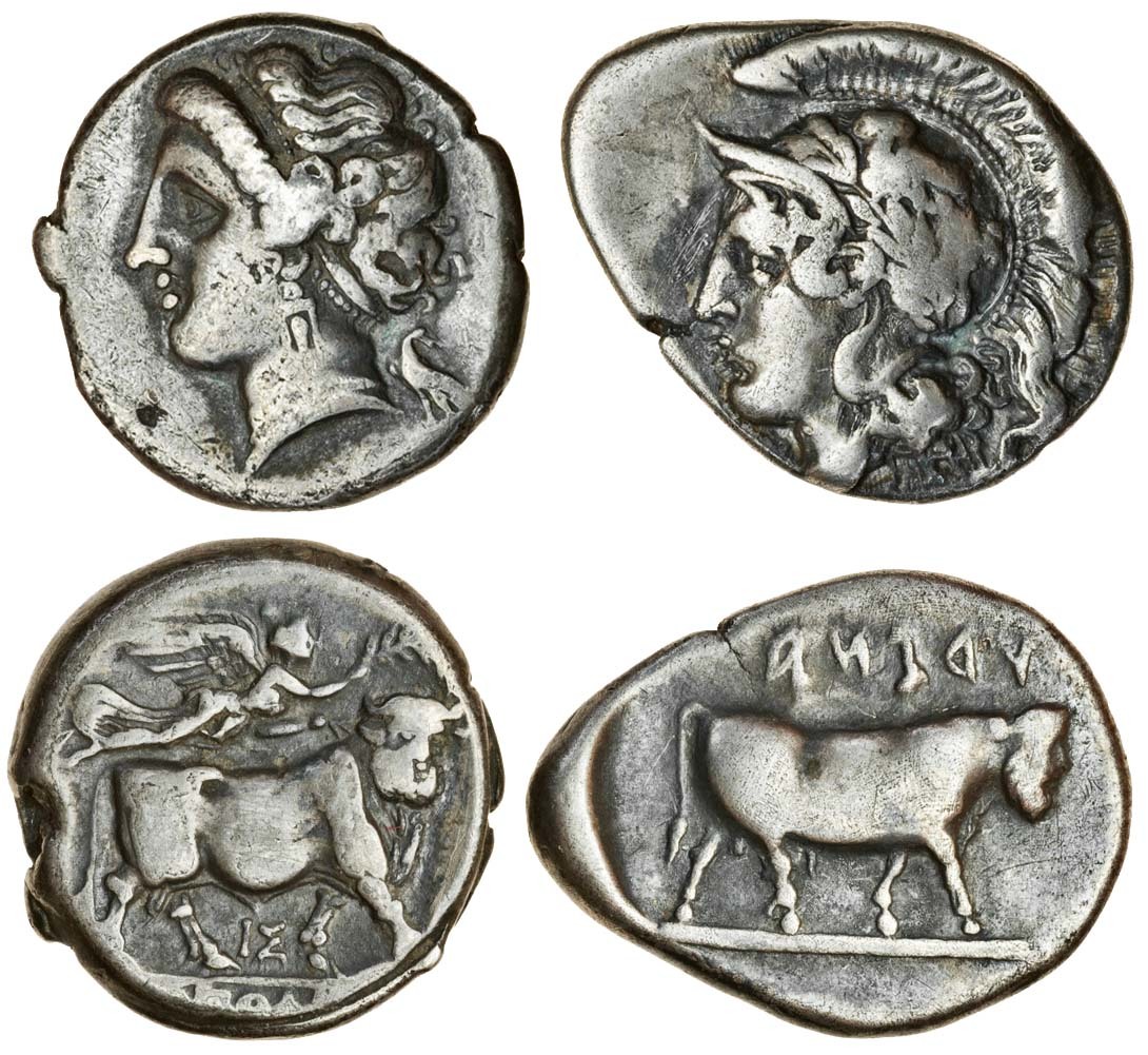Campania, Hyria (c.400-385 BC), AR Didrachm, 7.21g, head of Athena left, wearing crested helmet ornamented with owl and wreath, rev. man-headed bull walking right (SNG Copenhagen 374; Dewing 90), together with Neapolis (c.275-250 BC), AR Didrachm, 7.22g, head of nymph left, eagle behind, rev. man-headed bull walking right, head facing, Nike flying above, right, i below (SNG ANS 397), both good fine to almost very fine (2)
