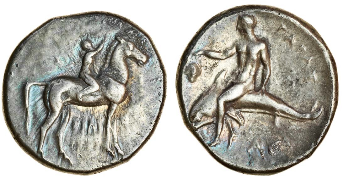 Calabria, Tarentum (c.302-280 BC), boy rider on standing horse right, crowning its head, rev. dolphin rider left, holding grapes, aa below (Vlasto 673), very fine