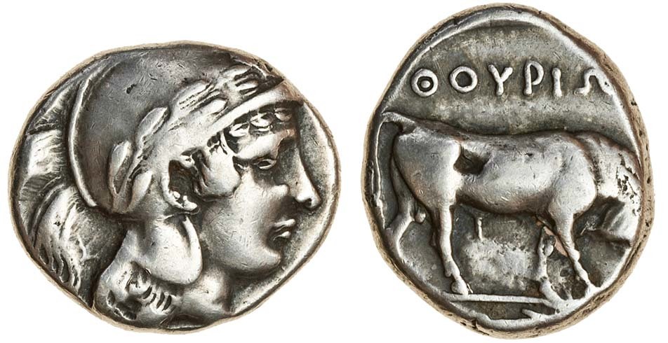 Lucania, Thurium (c.440-410 BC), AR Stater, 7.95g, head of Athena right, wearing laureate and crested helmet, rev. oypi[n], bull right, head lowered (SNG ANS 951ff), almost very fine