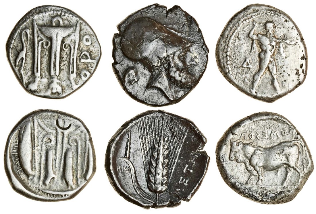 Lucania, Poseidonia (c.475-450 BC), AR Stater, 7.49g, Poseidon striding right, wielding trident, behind, rev. bull left (SNG ANS 670ff), together with a Stater, 7.83g, of Metapontum (c.340-330 BC), helmeted head of Leukippos right, lion's head behind, rev. ear of barley with club on leaf to right (Johnston class B; Hist. Num. 1575), and Bruttium, Kroton (c.480-430 BC), AR Stater, 7.78g, tripod, heron on left, rev. incuse tripod (Dewing 496), good fine to almost very fine (3)