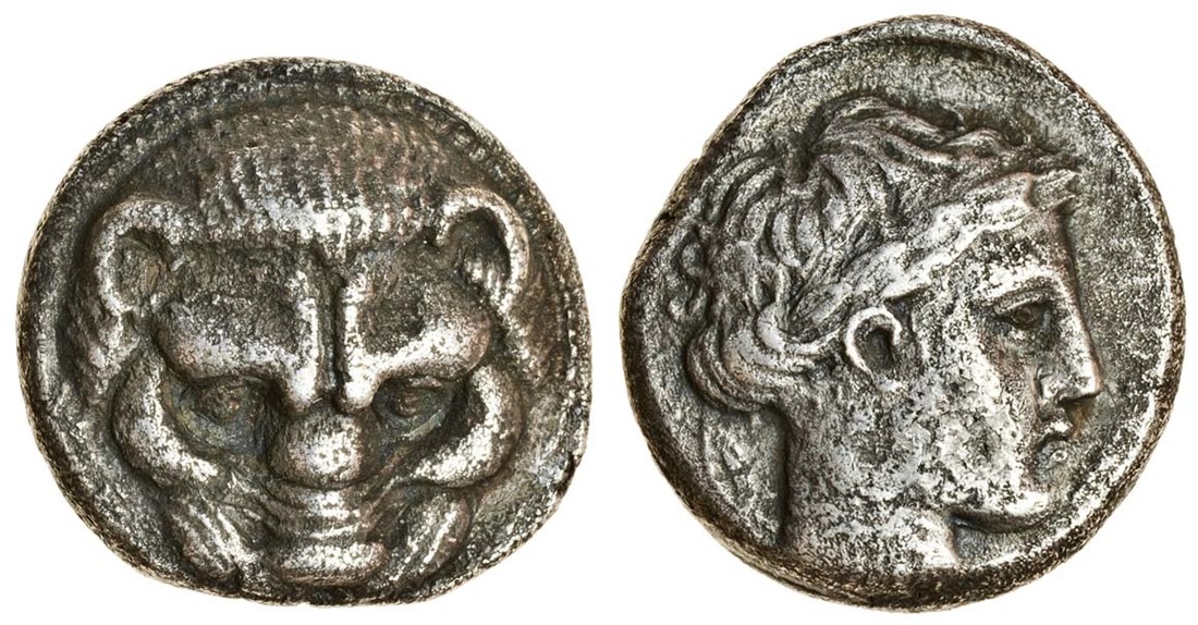 Bruttium, Rhegium (c.410-400 BC), AR Tetradrachm, 15.93g, lion's head facing, rev. laureate head of Apollo right, olive-spray behind (cf. Herzfelder 71), toned, surfaces lightly eroded, almost very fine