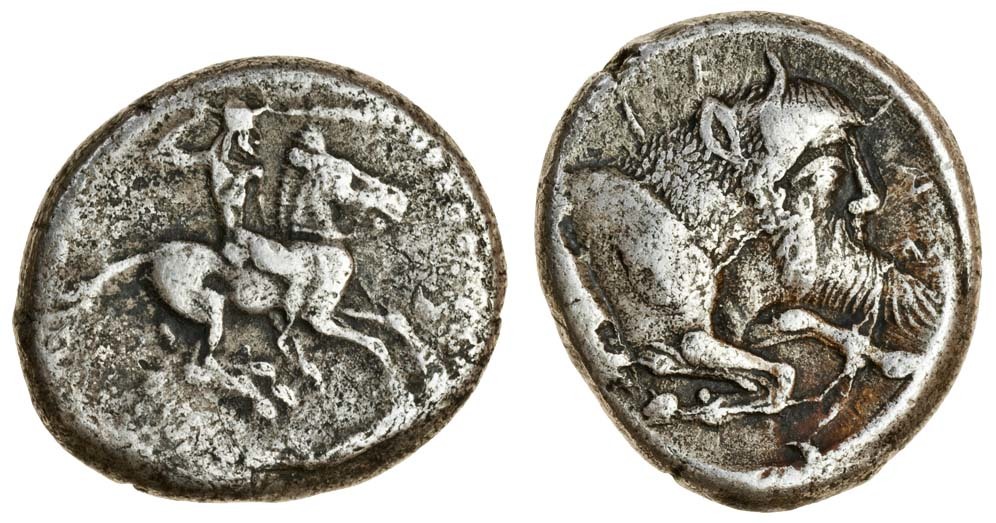 Sicily, Gela (c.490-475 BC), AR Didrachm, 8.53g, bearded and helmeted horseman right, wielding lance, rev. forepart of man-headed bull (the river-god Gelas) right (cf. Jenkins 79), good fine, reverse very fine