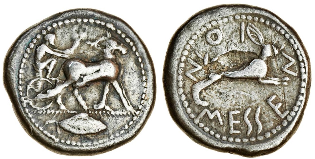 Sicily, Messana (c.475-471 BC), AR Tetradrachm, 17.03g, seated charioteer driving mule biga right, leaf in exergue, rev. messenion, hare leaping right (cf. Caltabiano 95), die-flaw on obverse, and metal flaw on reverse, good fine
