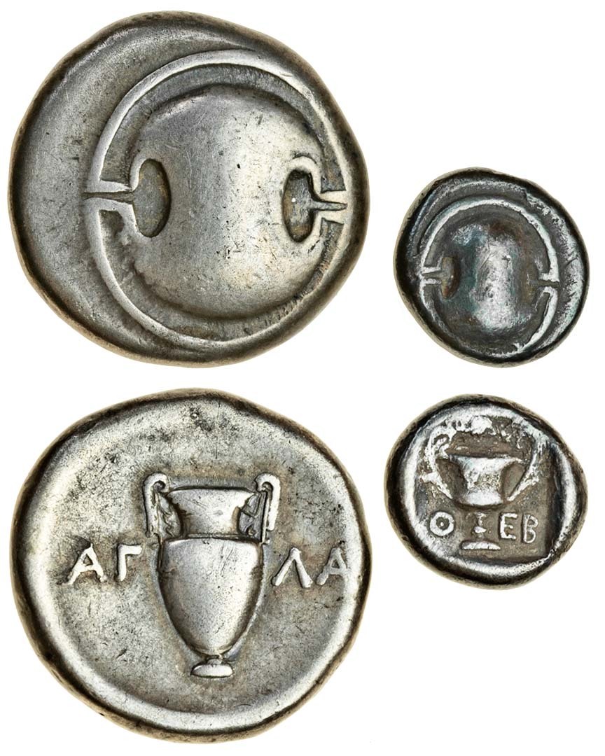 Boeotia, Thebes (c.363-338 BC), AR Stater, 12.01g, Boeotian shield, rev. amphora, aa across field (BCD 551; HGC 1334), together with a Hemidrachm, 2.64g (c.425-375 BC), Boeotian shield, rev. kantharos, -eb across field, club(?) above (cf. BCD 408), almost very fine (2)