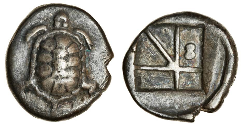 Aegina (c.350-338 BC), AR Drachm, 5.04g, tortoise, rev. incuse square divided into five compartments with two pellets in one of them (BMC 167), good very fine