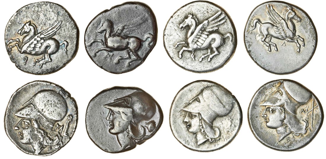 Corinth (c.345-307 BC), AR Stater, 7.55g, Pegasos flying left, koppa below, rev. helmeted head of Athena left, monogram and herm behind (Calciati 480; Ravel 1006), another similar, 8.18g, no symbol visible, good fine to almost very fine, Anactorium (c.350-300 BC, Pegasos left, an monogram below, rev. helmeted head of Athena left, uncertain symbol behind, dark tone, good fine, and Leukas (c.320-280 BC), Pegasos flying right, below, rev. helmeted head of Athena left, and mast with yard-arm behind, monogram below neck (Calciati 135), very fine (4)