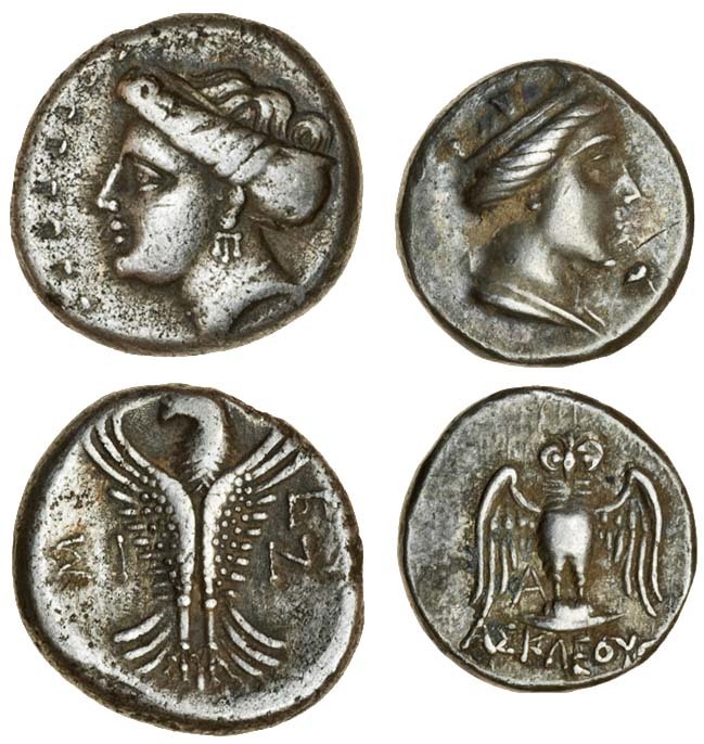 Paphlagonia, Sinope (4th-3rd cents. BC), AR Hemidrachm, 2.93g, head of nymph left, rev. i - n, eagle displayed facing, monogram on right (SNG BM 1496), almost very fine, and a Hemidrachm, 1.79g, of Amisos (Pontus) (c.300-250 BC), turreted head of Tyche right, rev. owl standing facing on shield, akeoy below (BMC 14), very fine (2)
