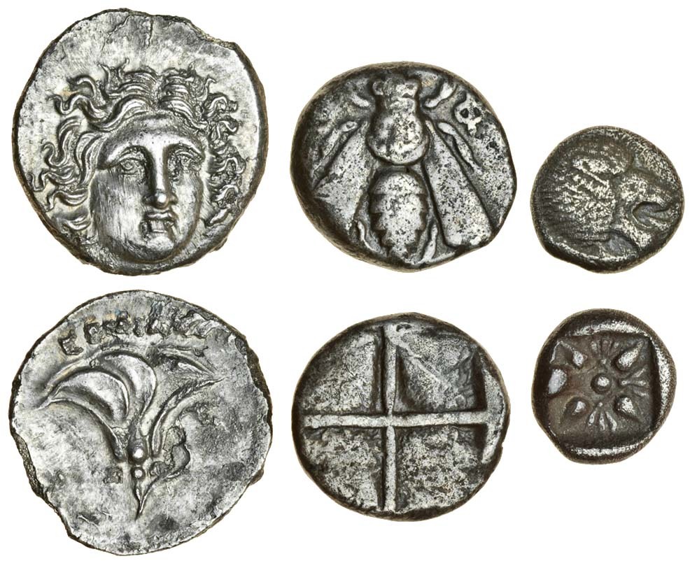 Ionia, Ephesos (c.340-330 BC), AR Hemidrachm, 2.99g, bee, rev. quadripartite incuse square (SNG Kayhan 246), Miletos (late 6th-early 5th cents. BC), AR Diobol, 1.03g, forepart of lion left, head turned back, rev. stellate pattern within incuse square (SNG Kayhan 468-475), and Pseudo-Rhodes (c.179-168 BC), AR Drachm, 2.28g, Thessalian mint, under Perseus of Macedon, three-quarters facing head of Helios, rev. epmia, rose with bud (SNG Finland 795; ex Sitichoro hoard), good fine to about extremely fine (3)
