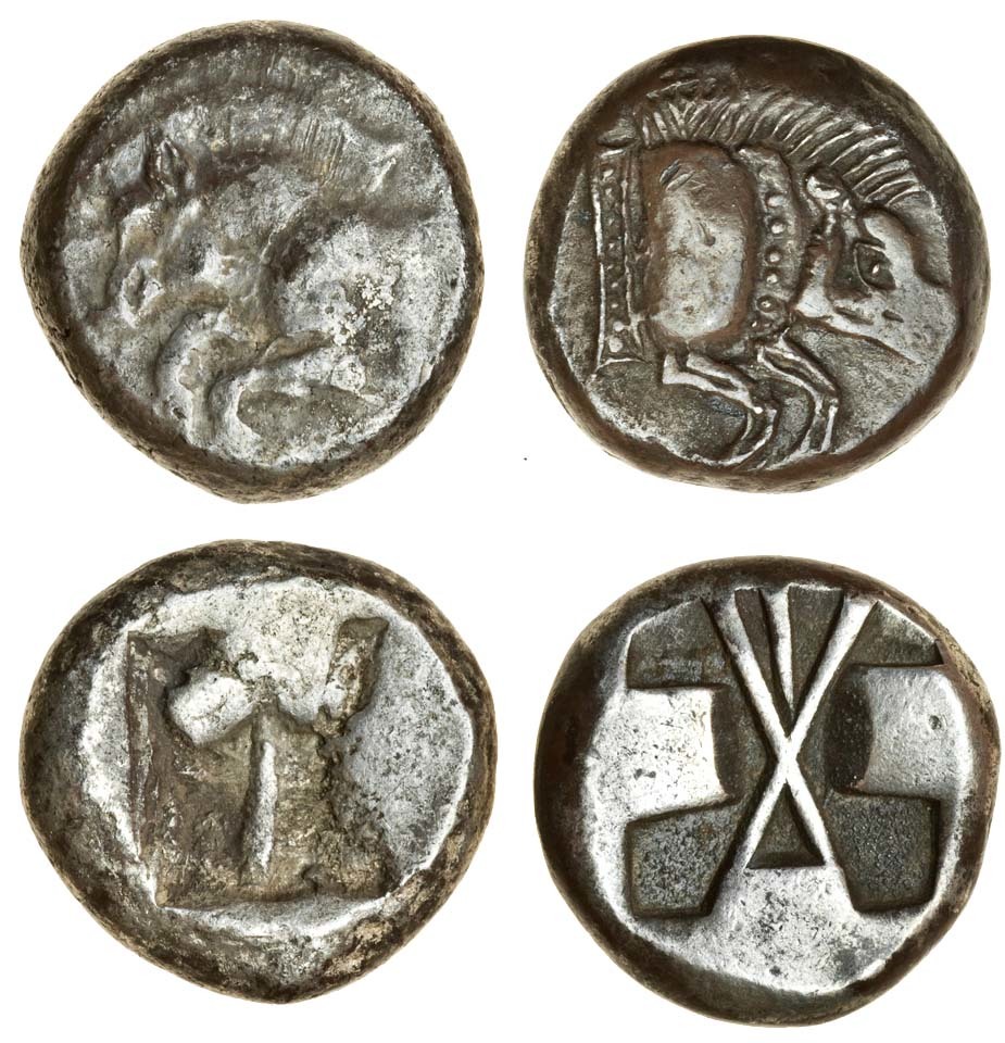 Lycia (c.520-460 BC), AR Stater, 9.25g, forepart of boar left, rev. irregular incuse square with line bisecting it (cf. SNG Copenhagen 2-3), good fine, and another, 9.09g, (c.480-460 BC), forepart of boar right, rev. crossed lines within square incuse punch (SNG Von Aulock 4054), about very fine (2)