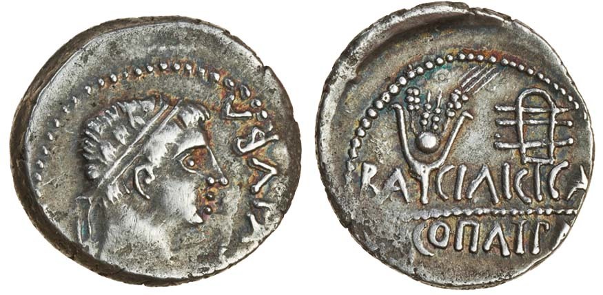 Kingdom of Mauretania, Juba II (25 BC-AD 23), AR Denarius, diademed head of Juba right, rex ivba, rev. baciicca keoatpa, headdress of Isis and sistrum (SNG Copenhagen 572), very fine