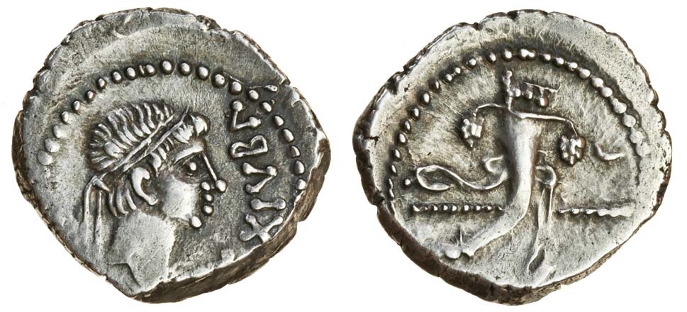 Kingdom of Mauretania, Juba II (25 BC-AD 23), AR Denarius, diademed head of Juba right, rex ivba, rev. cornucopia with transverse sceptre (SNG Copenhagen 581), good very fine