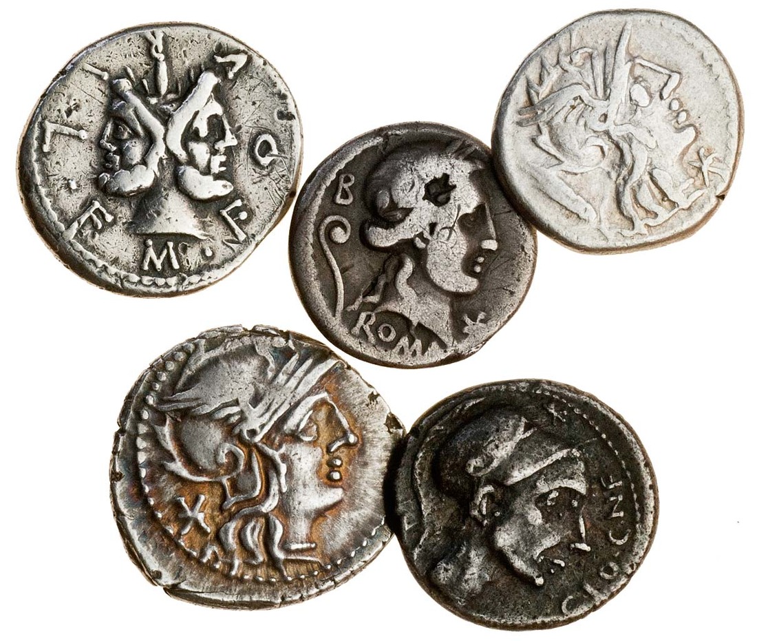 Roman Republic, AR Denarii (5), Ti. Minucius Augurinus (134 BC), Roma head right, rev. two togate figures either side of Ionic column (RRC 243/1), Cn. Domitius Ahenobarbus (128 BC), as last but ear of corn behind, rev. man attacking lion below Victory in biga right (RRC 261/1), C. Servilius Vatia, restored issue (82-80 BC), laureate head of Apollo right, rev. horseman left, attacking another before him (RRC 370/1b), M. Furius Philus (119 BC), laureate head of Janus, rev. Roma standing left, crowning trophy (RRC 281/1), Cn. Blasio (112-111 BC), helmeted head (Scipio Africanus ?) right, rev. Jupiter standing between Juno and Minerva (RRC 296/1), good fine to very fine (5)