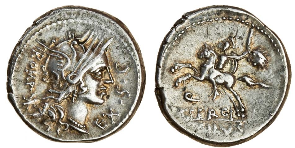M. Sergius Silus (116-115 BC), AR Denarius, helmeted head of Roma right, mark of value behind, rev. horseman galloping left, holding out sword and head of barbarian (RRC 286/1; Sydenham 534; Sergia 1), almost extremely fine