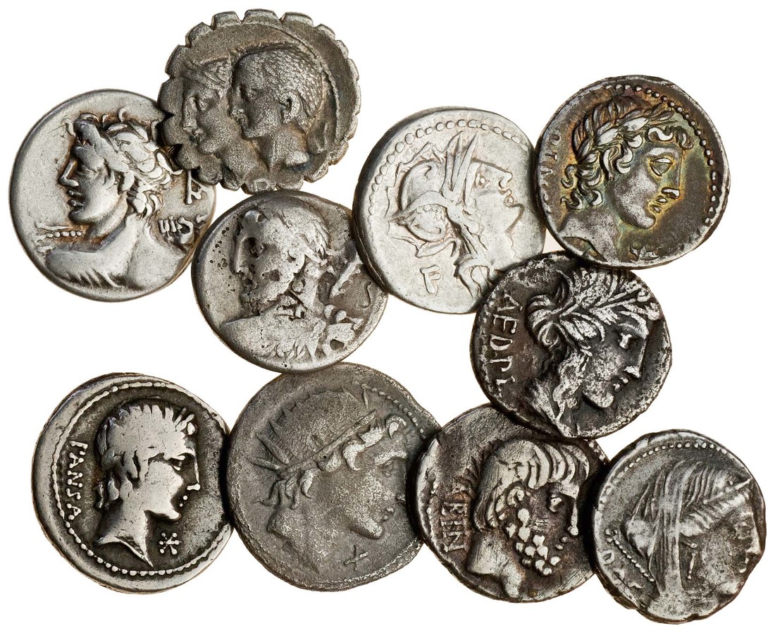 Roman Republic, AR Denarii (10), Ti. Quinctius 112-111 BC), back view of bust of Hercules left, holding club, rev. desultor on nearest of two horses galloping left, rat below (RRC 297/1), L. Caesius (112-111 BC), youthful bust of Vejovis left, seen from behind, rev. the two Lares seated right, dog between them (RRC 298/1), Mn. Aquillius (109-108 BC), radiate head of Sol right, rev. Luna in biga right (RRC 301/1), C. Sulpicius Galba (106 BC), serrate, laureate heads of the Dei Penates left, rev. two soldiers swearing an oath over recumbent pig (RRC 312/1), D. Iunius Silanus (91 BC), Roma head right, rev. Victory in biga right (RRC 337/3), C. Vibius Pansa (90 BC), laureate head of Apollo right, rev. Ceres walking right, holding out torches, pig before (RRC 342/3b), another, similar, but rev. Minerva in quadriga right (RRC 342/5b), L. Titurius Sabinus (89 BC), head of Tatius right, rev.Victory in biga right, caduceus in exergue (RRC 344/3), L. Rubrius (87 BC), veiled head of Juno right, rev. triumphal chariot right (RRC 348/2), and M. Fannius and L. Critonius (86 BC), head of Ceres right, rev. the two aediles, Fannius and Critonius seated right on subsellium, ear of corn on right (RRC 351/1), good fine to very fine (10)