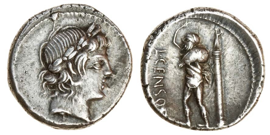 L. Marcius Censorinus (82 BC), AR Denarius, laureate head of Apollo right, rev. Marsyas standing left, wine-skin over shoulder, statue on column behind (RRC 363/1d; Sydenham 737; Marcia 24), almost extremely fine