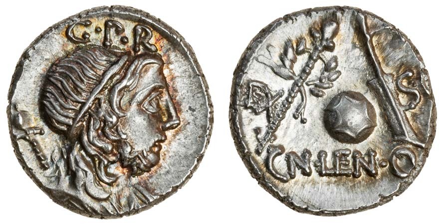 Cn. Cornelius Lentulus (76-75 BC), AR Denarius, diademed bust of the Genius of the Roman people, draped, right, sceptre on shoulder, g.p.r above, rev. ex - s c divided by globe between rudder and sceptre, cn. len. q below (RRC 393/1a; Sydenham 752; Cornelia 54), lovely iridescent toning, extremely fine