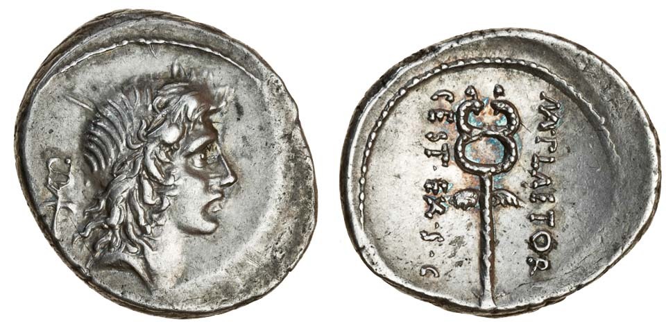 M. Plaetorius Cestianus (69 BC), AR Denarius, young male head right, with long, flowing hair, winged caduceus behind, rev. winged caduceus (RRC 405/5; Sydenham 807; Plaetoria 5), extremely fine