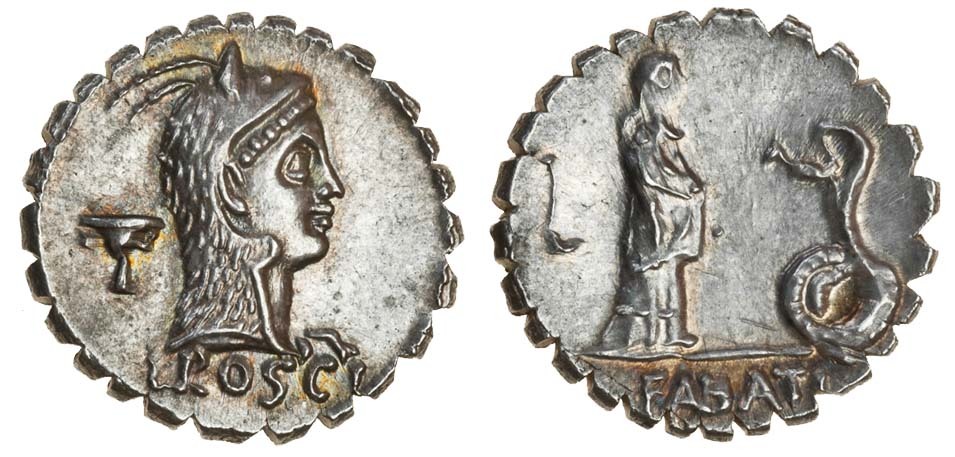 L. Roscius Fabatus (64 BC), AR serrate Denarius, head of Juno Sospita wearing goat-skin headdress right, symbol of cup (?) behind, rev. female standing right, before erect serpent, symbol of simpulum (?) on left (RRC 412/1, cf. symbols 198; Sydenham 915; Roscia 3), iridescent toning, good extremely fine