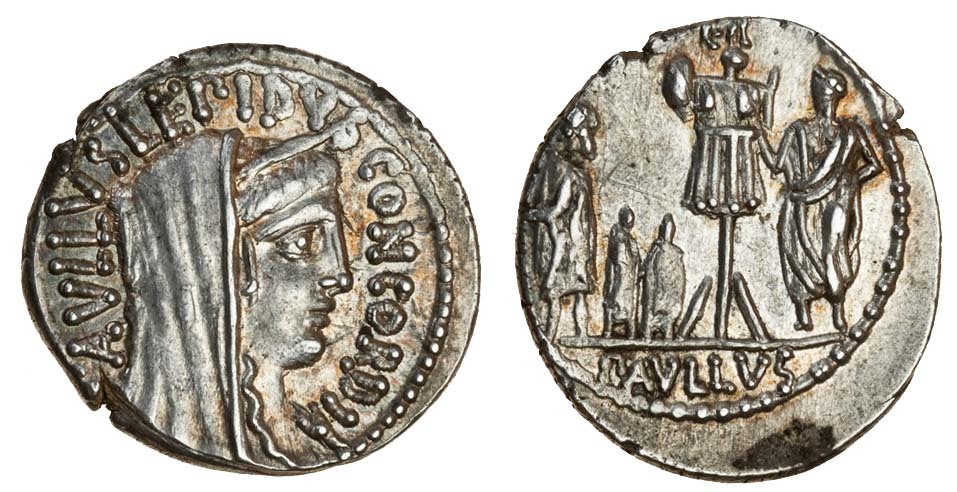 L. Aemilius Lepidus Paullus (62 BC), AR Denarius, veiled head of Concordia right, rev. L. Aemilius Paullus standing left before trophy, to left of which are Perseus and his two sons as captives (RRC 415/1; Aemilia 10), extremely fine