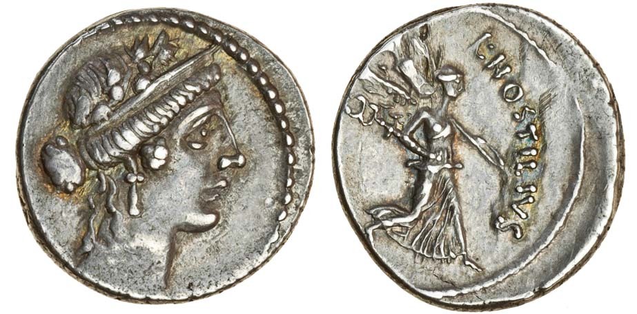 L. Hostilius Saserna (48 BC), AR Denarius, female head right, wearing oak-wreath, rev. Victory flying right, holding trophy and caduceus (RRC 448/1a; Sydenham 951; Hostilia 5), extremely fine
