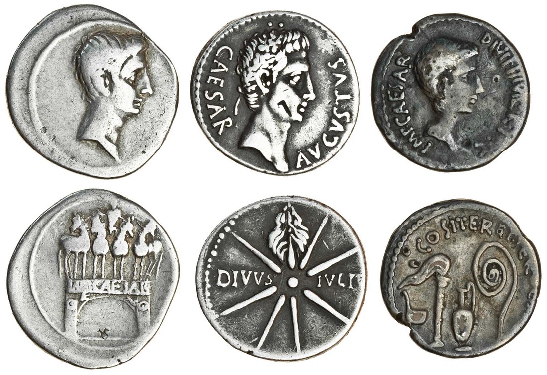 Augustus (27 BC-AD 14), AR Denarii (3), as Octavian, c.36 BC, bare head right, rev. priestly implements (RRC 538/1; Sydenham 1334), another, 30-29 BC, bare head right, rev. Octavian's Actian arch surmounted by Octavian in quadriga facing (RIC 267; RSC 123), and another, as Augustus, Caesaraugusta, 19-18 BC, head right wearing oak wreath, rev. divvs ivlivs, comet with tail upwards (RIC 37a; RSC 98), banker's mark on jaw, good fine or better (3)