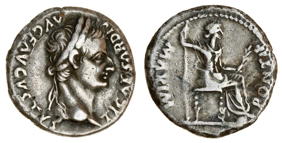 Tiberius (AD 14-37), AR Denarius or Tribute Penny, Lugdunum, laureate head right, rev. pontiff maxim, Livia as Pax seated right, holding branch and sceptre (RIC 30; RSC 16a), almost very fine