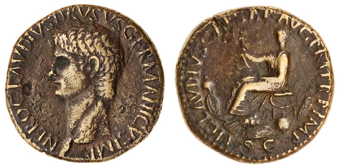 Nero Claudius Drusus (†9 BC), AE Sestertius, Rome, 41-42, bare head left, rev. ti clavdivs caesar avg p m tr p imp, s c in exergue, Claudius (or Drusus?) seated left on curule chair and holding branch, amidst an array of arms (RIC 93; C. 125), about very fine
