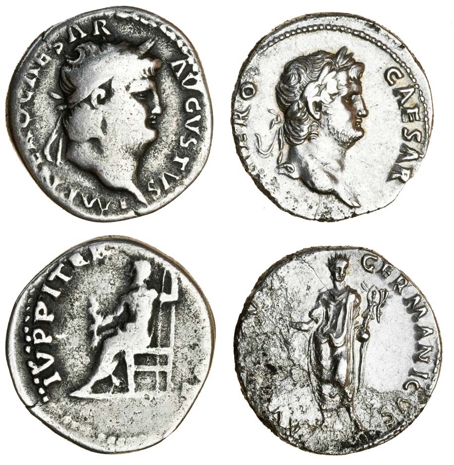 Nero (AD 54-68), AR Denarius, 64-65, laureate head right, rev. Nero standing facing, radiate and togate, holding branch and Victory (RIC 47; RSC 45), part of reverse surface corroded, otherwise good very fine, and another, 66-67, laureate head right, rev. Jupiter enthroned left, holding thunderbolt and sceptre (RIC 64; RSC 121), good fine (2)