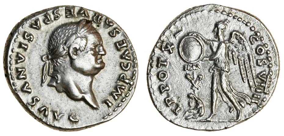Vespasian (AD 69-79), AR Denarius, 79, laureate head right, rev. Victory standing left, erecting trophy at base of which is seated Judaean captive (RIC 1068; RSC 552), almost extremely fine