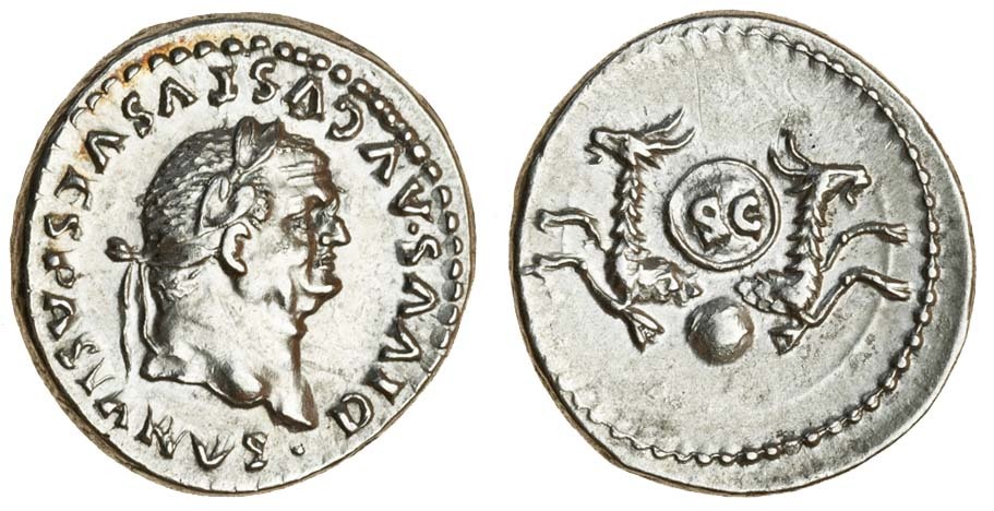 Divus Vespasian (†AD 79), AR Denarius, 80-81, laureate head right, rev. two capricorns back-to-back supporting shield inscribed sc (RIC 357; RSC 497), small scratch in obverse field, extremely fine