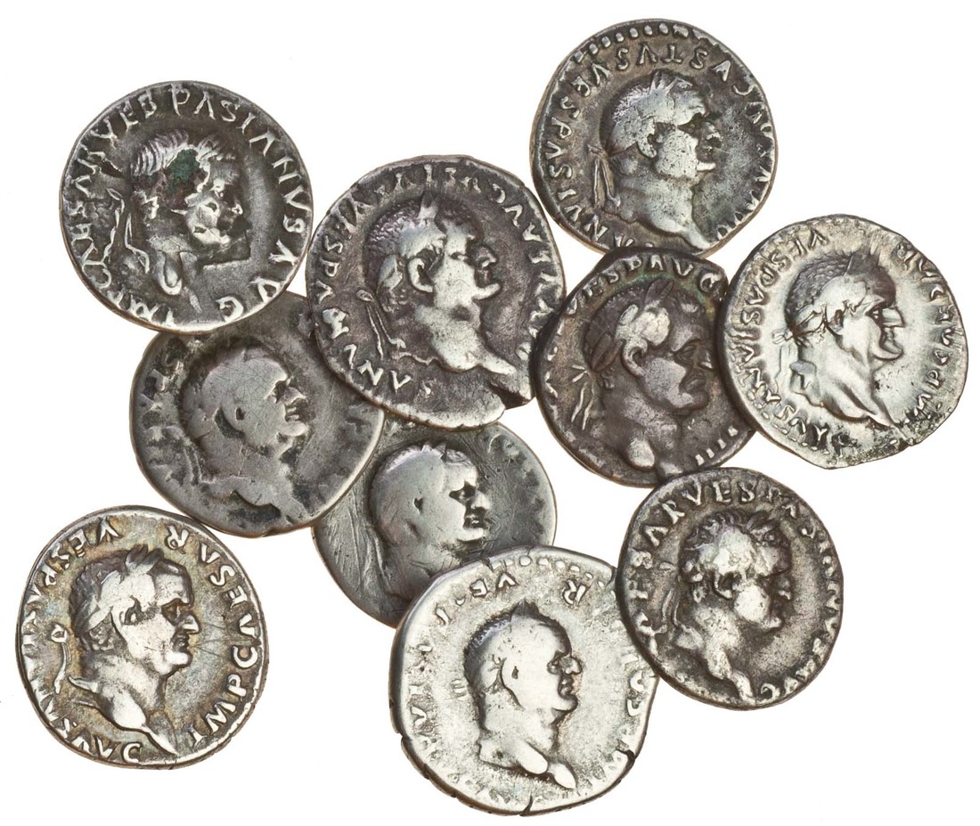 Vespasian (AD 69-79), AR Denarii (10), laureate head right, revs. Titus and Domitian seated left on curule chairs (RIC 1124), plated, eagle facing on altar (2), bull standing right, Pax seated left, priestly implements, chipped, winged caduceus, prow right, star above, and as Divus Vespasian, revs. slow quadriga left, and shield on column between two laurel branches, fine to good fine (10)