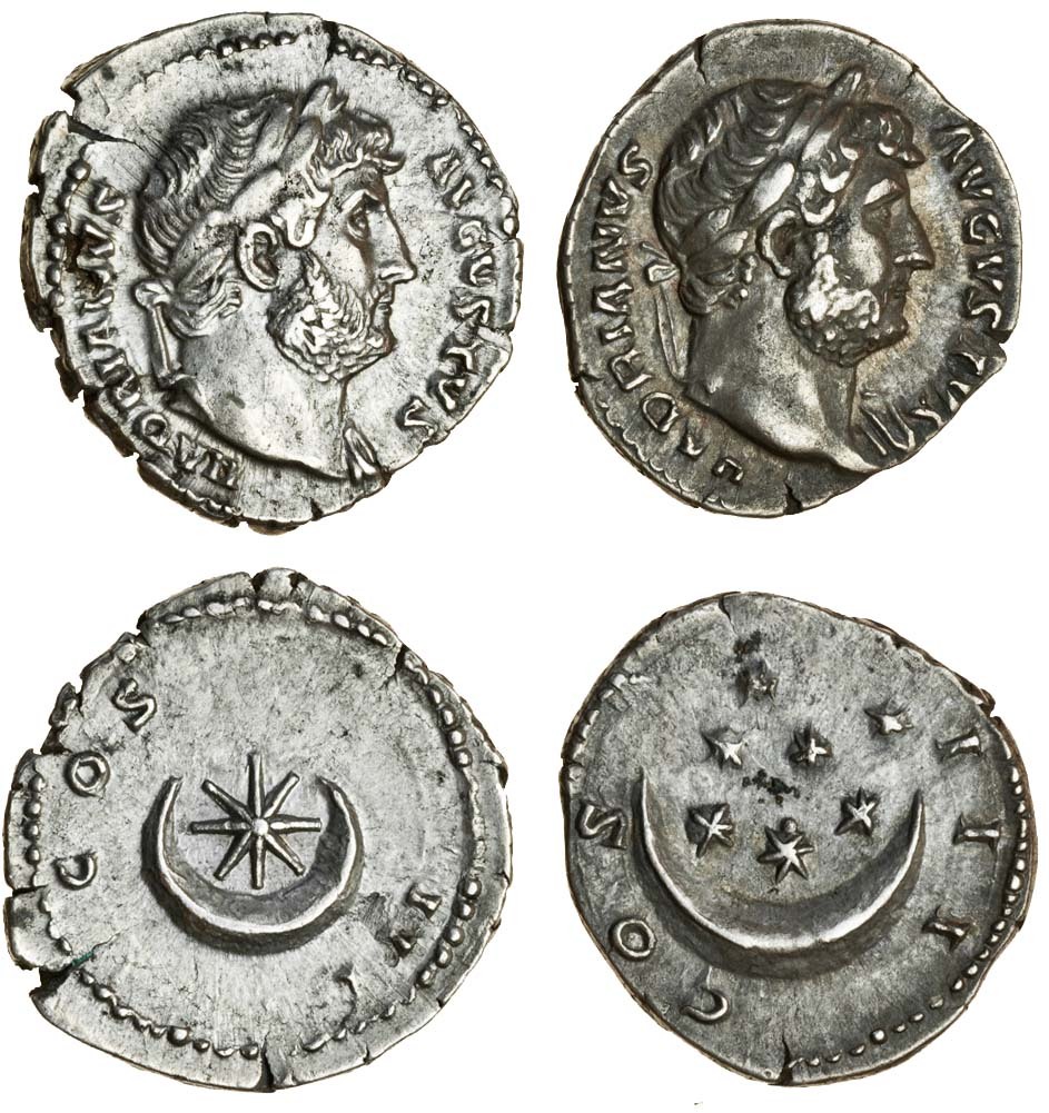 Hadrian (AD 117-138), AR Denarius, laureate head right, rev. star within crescent moon (RIC 200; RSC 460), and another with seven stars within and above crescent moon (RIC 202; RSC 466), good very fine (2)