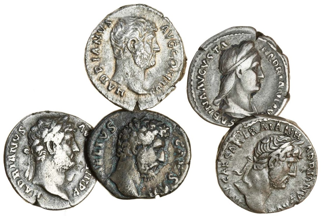 Hadrian (AD 117-138), AR Denarius, bare head right, rev. restitvtori galliae, Hadrian standing right, raising up kneeling figure of Gallia left (RIC 324; RSC 1247), very fine, another, laureate head right, rev. Africa reclining left, holding scorpion, basket of fruit on left (RIC 299; RSC 138), good fine, and another, same bust, rev. Aequitas standing left (RIC 80; RSC 1119), very fine, his wife Sabina, AR Denarius, diademed, draped bust right, rev. Pudicitia standing left (RIC 407; RSC 62), almost very fine, and Aelius Caesar, bare head right, rev. Spes walking left (RIC 431; RSC 52a), good fine (5)