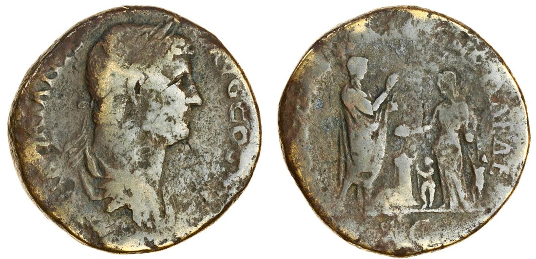 Hadrian (AD 117-138), AE Sestertius, 134-8, laureate, draped bust right, rev.[adventvi avg iv]daeae, Hadrian standing right, right hand raised, before altar over which the personification of Judaea, standing left between two children holds box, sc in exergue (RIC 890c; Hendin 1604; BMC 1655), very rare, fair