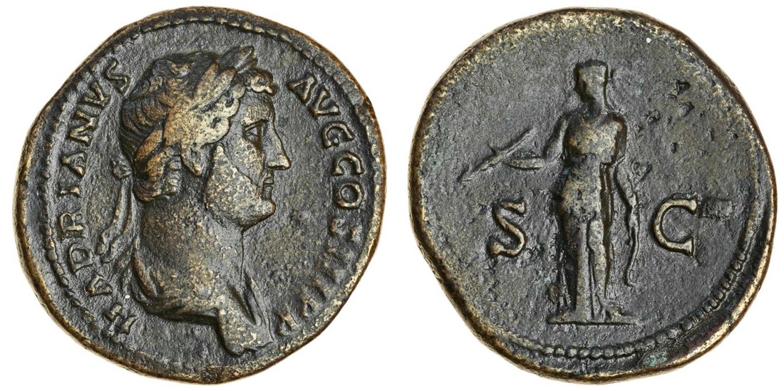 Hadrian (AD 117-138), AE Sestertius, Rome, 136, laureate and draped bust right, rev. sc, Diana standing left, holding arrow and bow (RIC 777 var.), about very fine