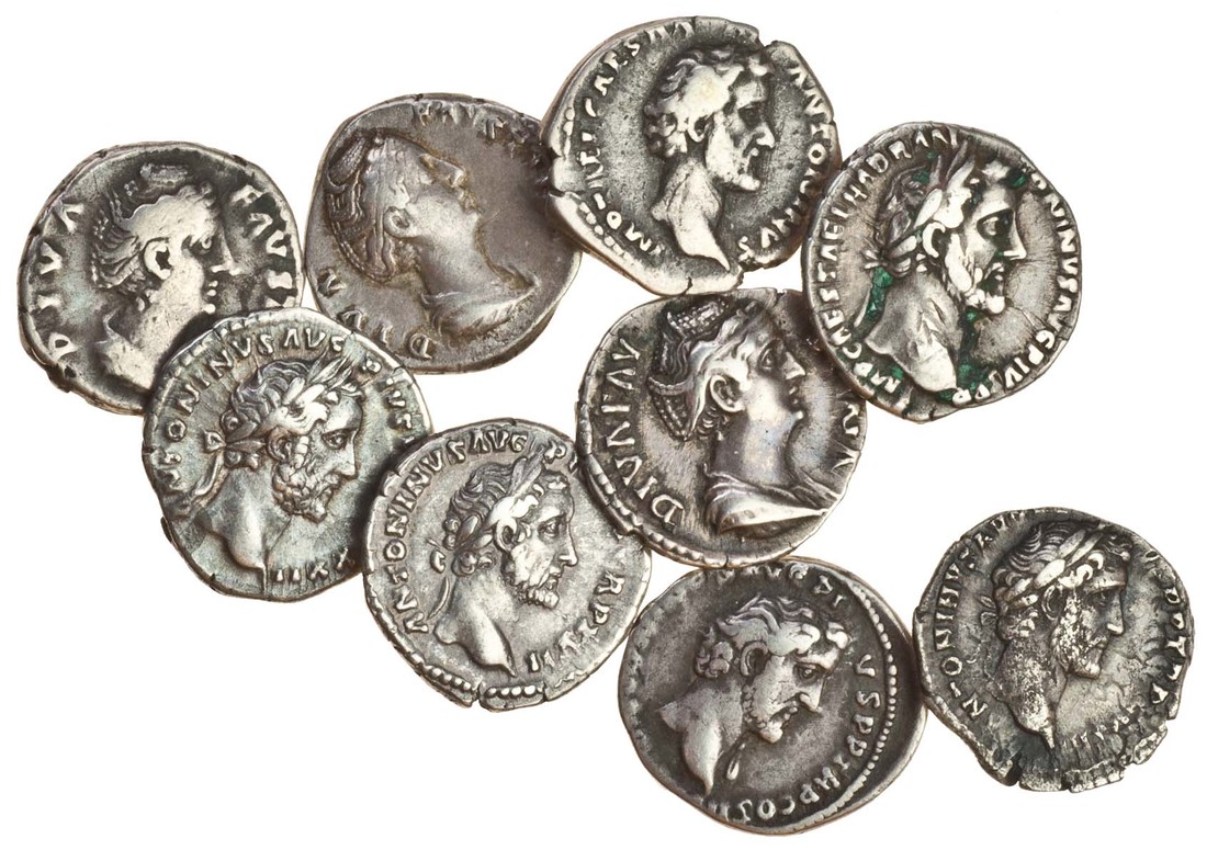 Antoninus Pius (AD 138-161), AR Denarii (6), laureate head right, revs. Pietas standing right, holding hind and basket of fruits, altar on right ((RIC 201; RSC 616), temple (RSC 799), modius with corn ears (RSC 33), Aequitas standing left, statue in shrine (RSC 331), bare headed and draped bust of young Marcus Aurelius right (RSC 15), and his wife Diva Faustina I (3), draped bust right, revs. wreath on draped throne with sceptre leaning against (RSC 131), peacock right (RSC 175), and Aeternitas standing facing, head left (RSC 32), good fine to very fine (9)