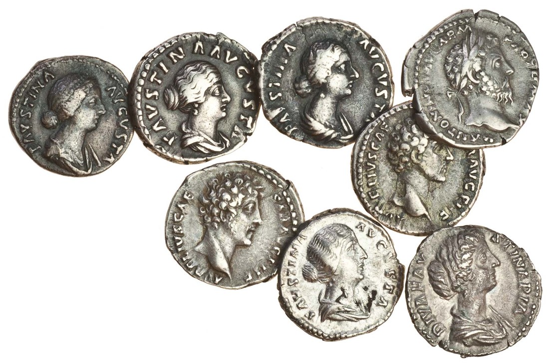 Marcus Aurelius (AD 161-180), AR Denarii (3), as Caesar, bare head right, revs. Honos standing left (RSC 110), Minerva standing right (RSC 618), as Augustus, laureate head right, rev. Pax standing left (RSC 435), and his wife Faustina Jnr. (5), draped bust right, revs. Fecunditas standing right (RSC 99), Concordia standing left (RSC 21), Fecunditas standing facing between two children, two infants held in arms (RSC 95), Juno standing left, peacock at feet (RSC 120), and Diva Faustina, rev. seven stars and crescent moon (RSC 83), good fine to very fine (8)