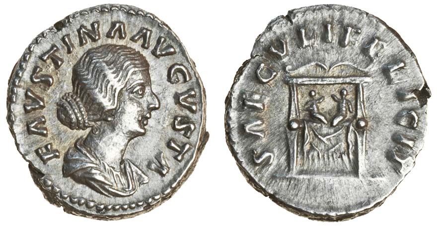 Faustina Jnr, wife of Marcus Aurelius, AR Denarius, draped bust right, rev. saecvli felicit, draped throne on which are two baby boys (RIC 710; RSC 190), extremely fine