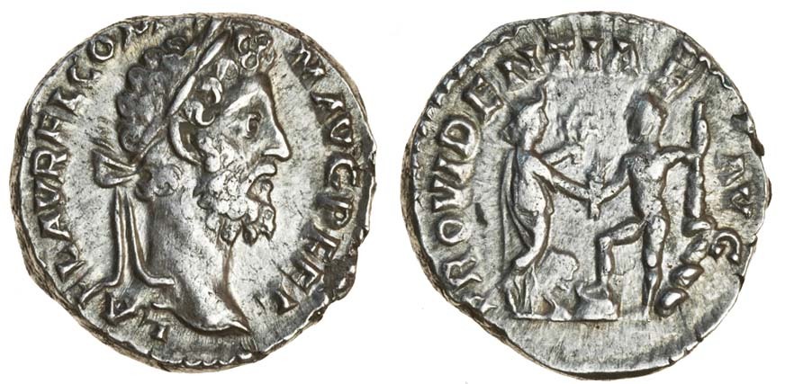 Commodus (AD 177-192), AR Denarius, laureate head right, rev. providentiae avg, Commodus as Hercules standing left, right foot on prow and holding club on tree-trunk, clasping hands with Africa standing right and holding sistrum (RIC 259a; RSC 643), good very fine