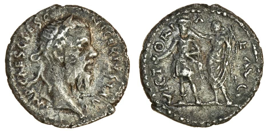 Pescennius Niger (AD 193-194), AR Denarius, Antioch, laureate head right, rev. victoriae avg, Pescennius standing facing, being crowned by Victory standing left (RIC - ; RSC - ; BMC - ), metal slightly porous, very fine, very rare