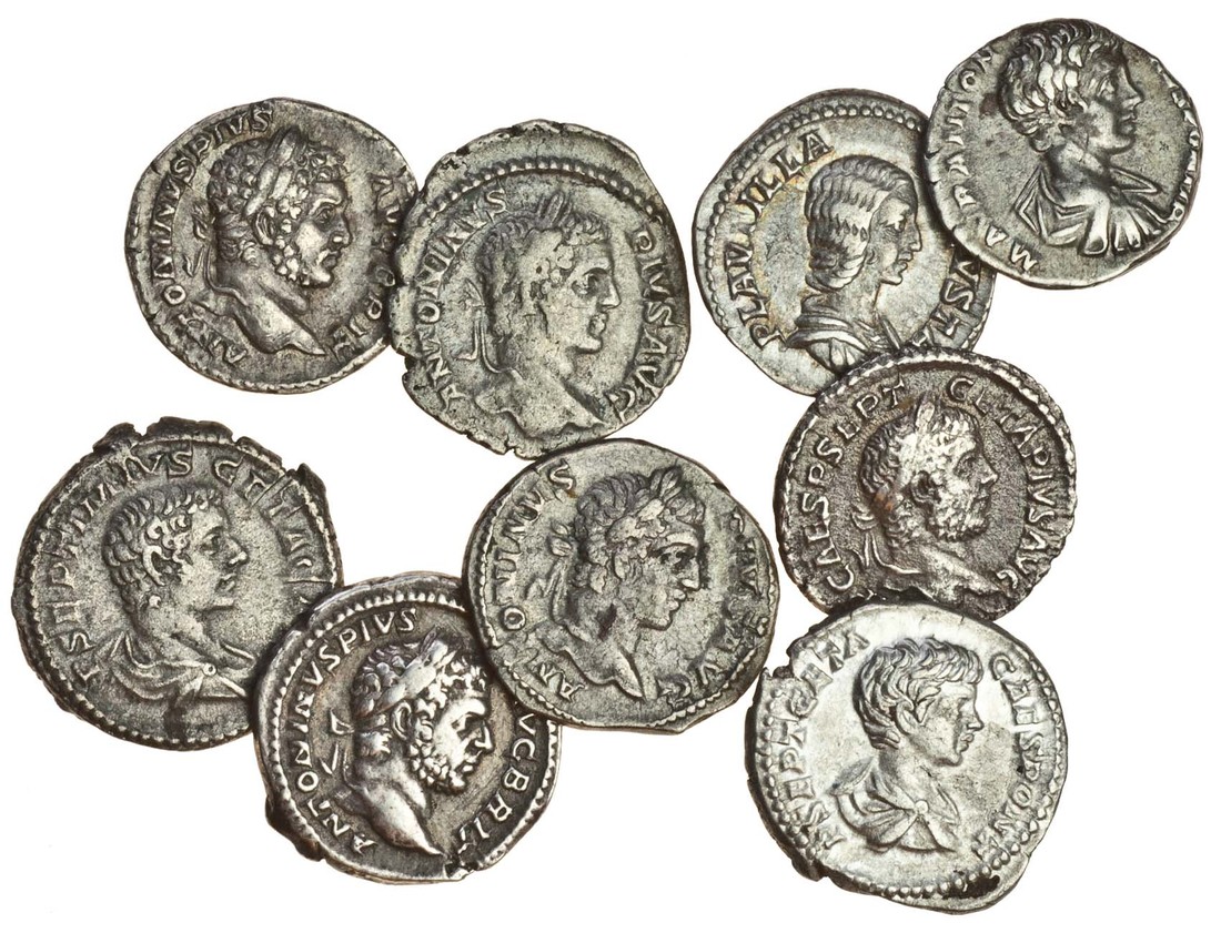 Severan AR Denarii (9), Caracalla, AR Denarii (4), laureate head right, revs. Caracalla on horseback right (RSC 510), veiled emperor sacrificing left (RSC 689), Mars striding left (RSC 150), Serapis standing left (RSC 195), his wife Plautilla, AR Denarius, draped bust right, rev. Venus standing left, Cupid at feet (RSC 25), Geta, AR Denarii (4), Prince and trophy (RSC 157), bucranium between priestly implements, Providentia standing left (RSC 171), Geta on horseback left, trampling fallen foe (RSC 123), fine to very fine (9)