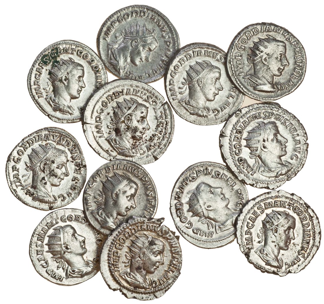 Gordian III (AD 238-244), AR Antoniniani (12), all with radiate, draped and cuirassed bust right, revs. Fides Militum standing left (RIC 1; RSC 86), Fortuna seated left (RIC 144; RSC 98), Jupiter standing left, holding thunderbolt over small figure of Gordian (2)(RIC 2; RSC 105), Jupiter standing facing, head right (RIC 84; RSC 109), Liberalitas standing left, holding abacus and cornucopia (RIC 67; RSC 142), Mars striding left (RIC 212; RSC 162), Mars walking right (RIC 147; RSC 160), Gordian standing right in military dress (RIC 93; RSC 266), Apollo seated left (RIC 88; RSC 250), Gordian standing right in military dress (RIC 216; RSC 319), and Victory standing left, holding shield on captive (RIC 154; RSC 348), very fine to extremely fine (12)