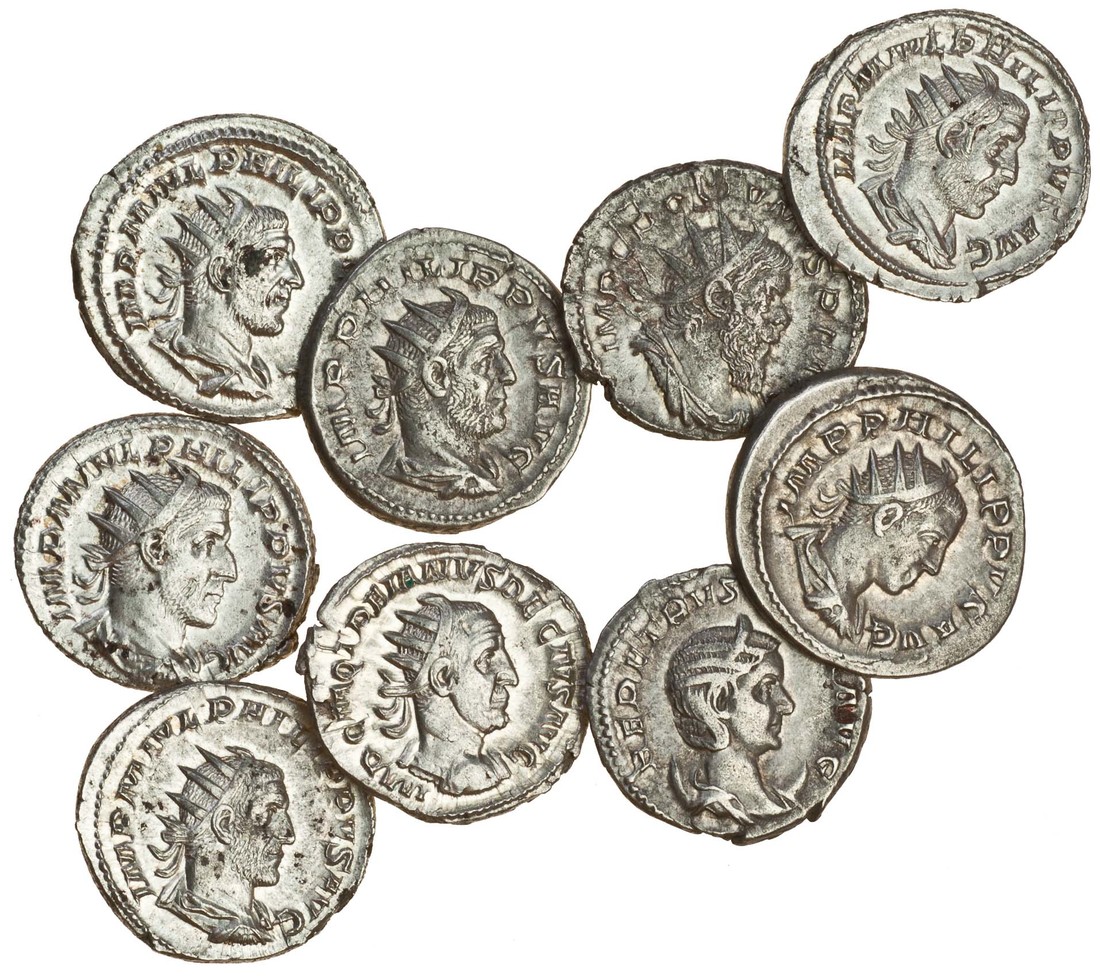 Philip I (AD 244-249), AR Antoniniani (5), all with radiate, draped and cuirassed bust right, revs. Aequitas standing left (RIC 27b; RSC 9), seated figure on elephant left (RIC 58; RSC 17), Felicitas standing left (RIC 4; RSC 136), Roma seated left (RIC 44; RSC 165), Salus standing left (RIC 47; RSC 205), Philip II, rev. goat standing left (RIC 224; RSC 72), Trajan Decius (AD 249-251), rev. Dacia standing left (RIC 12b; RSC 16), his wife Herennia Etruscilla, diademed, draped bust on crescent right, rev. Juno standing left, peacock at feet (RIC 57; RSC 14), and Postumus (AD 259-268), radiate, draped and cuirassed bust right, rev. Postumus standing left in military dress (RIC 54; RSC 243), very fine to extremely fine, mainly extremely fine (9)