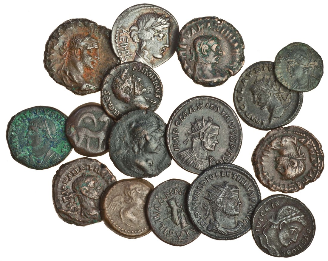 Miscellaneous Roman, comprising a Denarius of M. Fannius and L. Critonius (86 BC), head of Ceres right, rev. the aediles Fannius and Critonius seated right on subsellium (RRC 351/1), almost very fine, Antoniniani (3) of Claudius II, Diocletian and Maximian, a Quadrans of Augustus (RIC 420), Folles of Crispus (2) (Antioch and Siscia), a Constantinopolis Follis, a plated (?) Denarius of Antoninus Pius, four mid-later third century billon Tetradrachms from Alexandria, two Seleucid bronzes, winged bust of Eros, rev. headdress of Isis (Antiochos VII), the other with similar obverse, rev. Victory walking left, and a small Carthage bronze , fine to almost very fine (16)