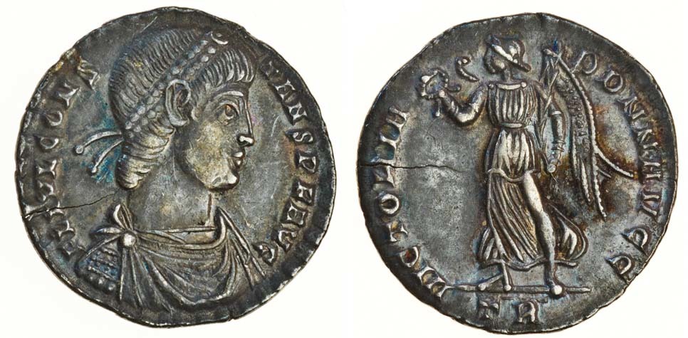 Constans (AD 337-350), AR Siliqua, 2.60g, Trier, 347-348, pearl-diademed, draped and cuirassed bust right, fl ivl cons-tans p f avg, rev. victoria dd nn avgg, Victory standing left, holding wreath and palm, tr in exergue (RIC 176; RSC 152†a), minor crack in flan, extremely fine