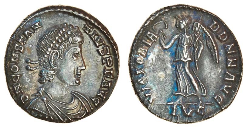 Constantius II (AD 337-361), AR Siliqua, 2.45g, Lugdunum, 360-363, pearl-diademed, draped and cuirassed bust right, d n constan-tivs p f avg, rev. victoria dd nn avg, Victory walking left, holding wreath and palm, lvg in exergue (RIC 214; RSC 259a), extremely fine