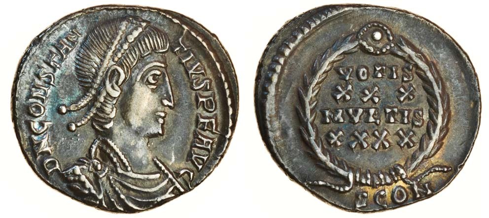 Constantius II (AD 337-361), AR Siliqua, 3.59g, Arles, d n constan-tivs p f avg, rev. votis / xxx / mvltis / xxxx in wreath, pcon in exergue (RIC 207; RSC 342-3c), extremely fine