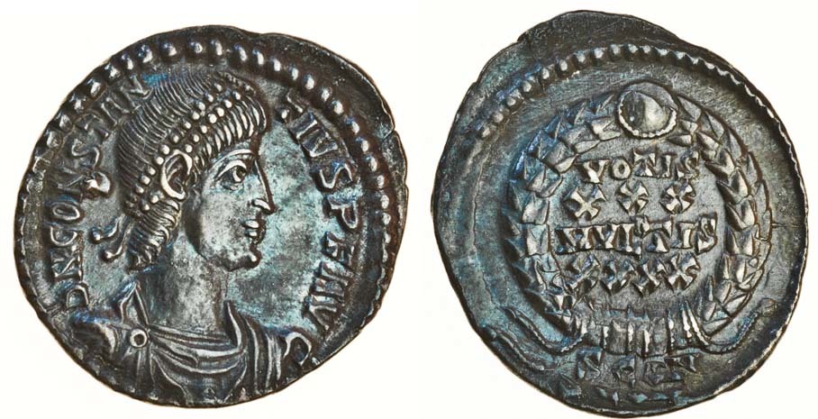 Constantius II (AD 337-361), AR Siliqua, 2.11g, Arles, d n constan-tivs p f avg, rev. votis / xxx / mvltis / xxxx in wreath, scon in exergue (RIC 207; RSC 342-3c), extremely fine