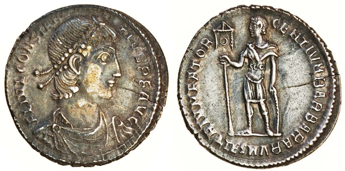 Constantius II (AD 337-361), AR Miliarense, 4.45g, Thessalonica, 340-350, pearl-diademed, draped and cuirassed bust right, fl ivl constan-tivs p f avg, rev. trivmfator gentivm barbararvm, emperor standing left, holding standard and resting left hand on shield at his side, tes in exergue (RIC 89; cf. RSC 192), minor crack in flan, almost extremely fine, very rare